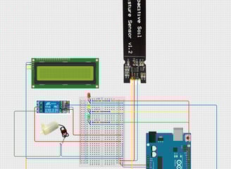 The image illustrates an IoT-based soil moisture monitoring system using Arduino technology. At the core of the setup is an Arduino Uno microcontroller, which reads data from a capacitive soil moisture sensor. This sensor accurately measures the moisture content in the soil without corroding over time, unlike resistive sensors. The system displays real-time soil moisture levels on a 16x2 LCD screen for easy monitoring. It also features LEDs to indicate different moisture levels and includes a water pump module controlled via a relay. When soil moisture falls below a certain threshold, the Arduino activates the relay to turn on the pump, automating irrigation. The use of a breadboard allows for easy circuit prototyping and wiring. This type of smart irrigation system is ideal for agricultural applications, helping conserve water and ensuring crops receive adequate moisture, improving efficiency and productivity.